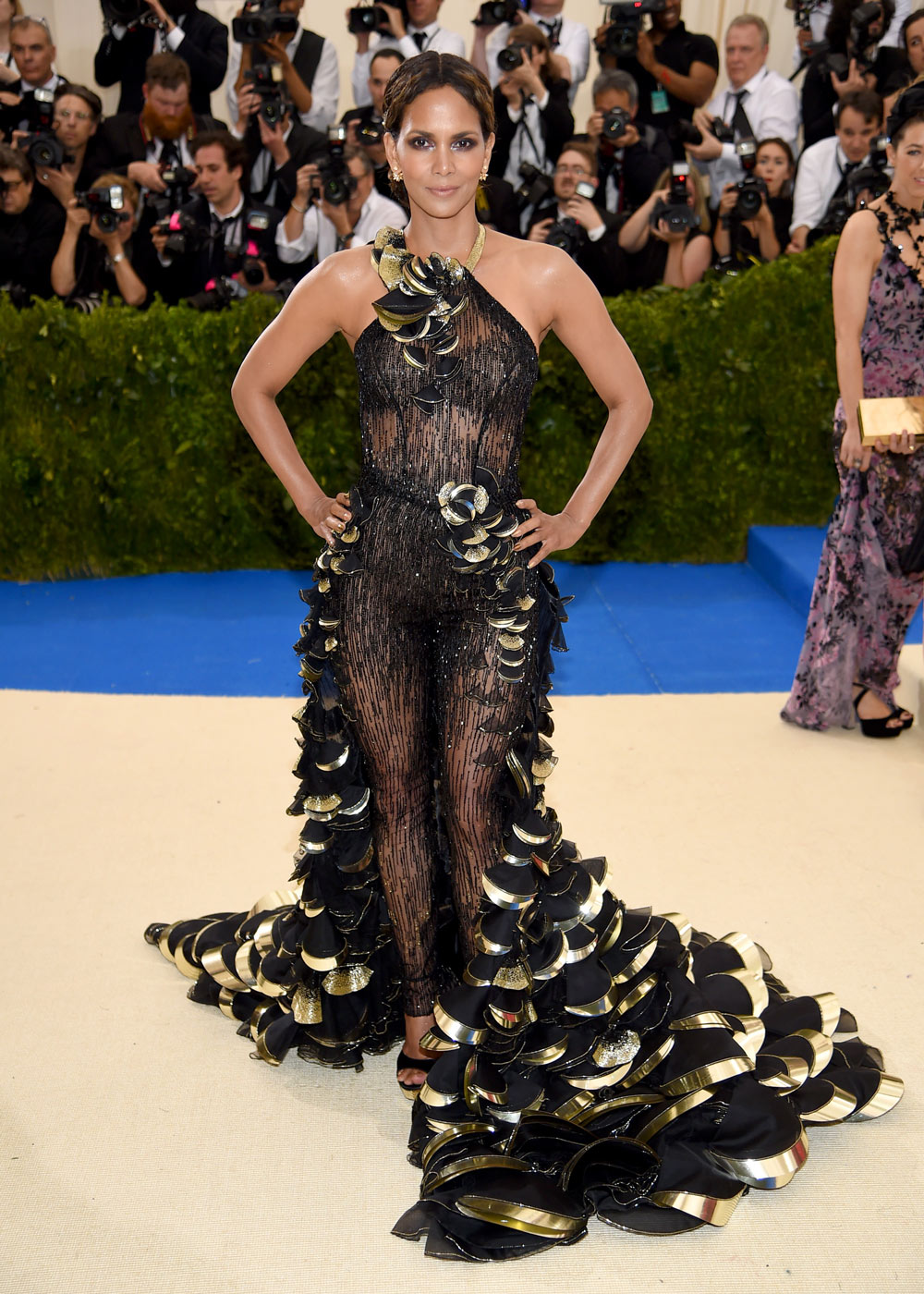 But one Vogue cover girl who’s never walked the red carpet just made her big debut in the most dramatic way possible. Halle Berry arrived wearing a sheer body-hugging halter jumpsuit with over-the-top tiered train that left our jaws on the floor.